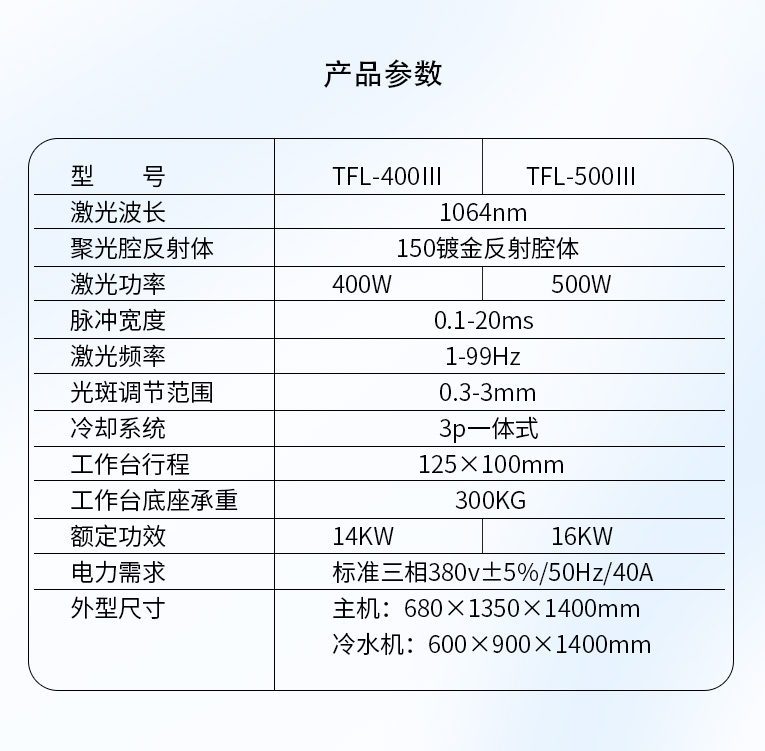 TFL-400Ⅲ型模具激光焊機是通發激光公司自主研發的一款大功率激光焊接機,采用通發自主研發的二代精密雙燈電源為燈泵浦驅動電源,配置觸摸屏,操作更方便。主機具備激光頭手搖升降與工作臺按鈕電動升降實現焊接不同厚度模具的激光焊加工。本款機型更適用于各類大功率、大面積激光修補的模具。由于激光功率大,同時可激光焊接鈹銅模具,鋁材模具或鋁材零件。在大面積激光修補模具時,可以使用更粗的焊絲,激光焊接效率大幅提升。
