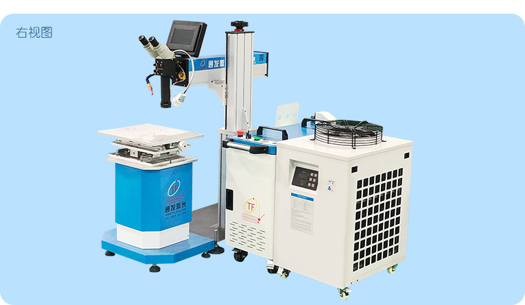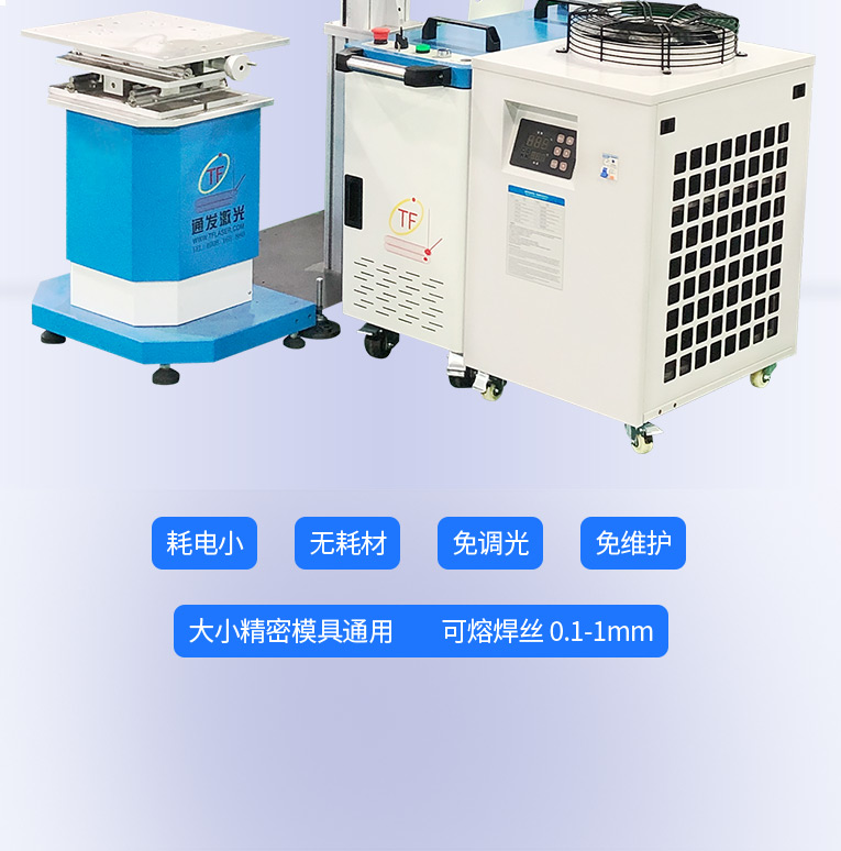 采用光纖激光器,反射率高,能量強,免維護,免調光,功耗少,相比傳統 模具焊來說,體積小,安全,穩定性好超長使用壽命。 1000W光纖激光器,滿足銅、鋁焊接量大的模具及產品焊接加工需要。 高承重底座及工作臺,保持輕便靈活的優點,同時提供更高承載能力。 配備.1.5P大功率一體式水冷水機,保證了大功率焊接的穩定性。