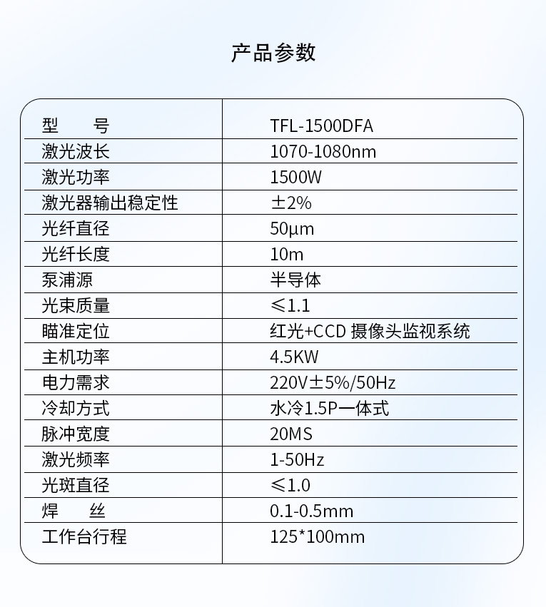 采用光纖激光器,反射率高,能量強(qiáng),免維護(hù),免調(diào)光,功耗少,相比傳統(tǒng) 模具焊來說,安全,穩(wěn)定性好超長使用壽命。 1500W光纖激光器,滿足銅、鋁焊接量大的模具及產(chǎn)品焊接加工需要。 高承重底座及工作臺,保持輕便靈活的優(yōu)點,同時提供更高承載能力。 配備.1.5P大功率一體式水冷水機(jī),保證了大功率焊接的穩(wěn)定性。